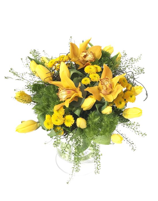 Lilledest on kasutatud kimbus krüsanteeme, nelke ja orhidee Vanda õisi.