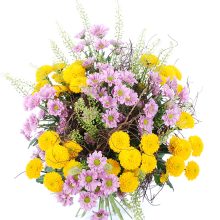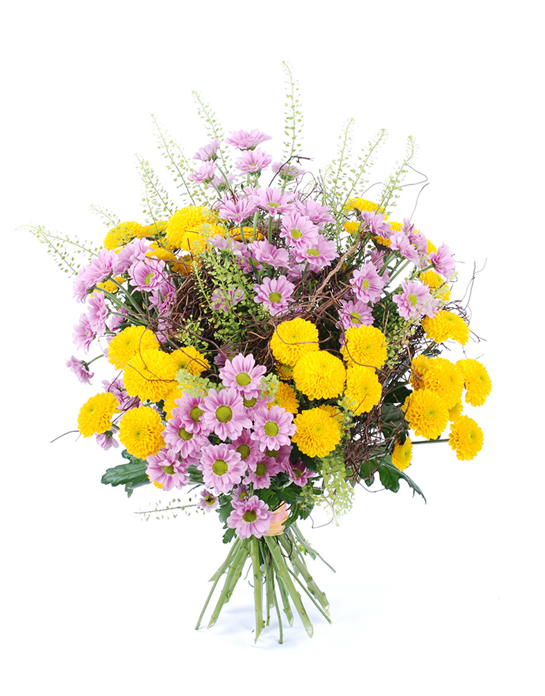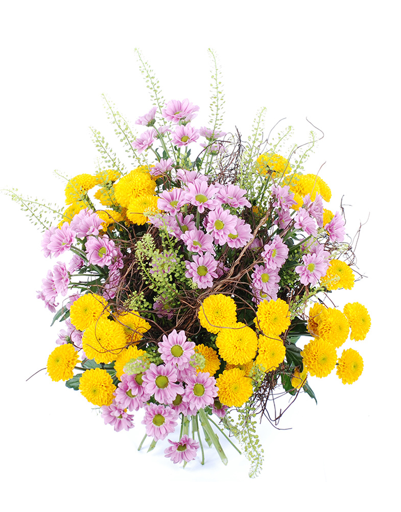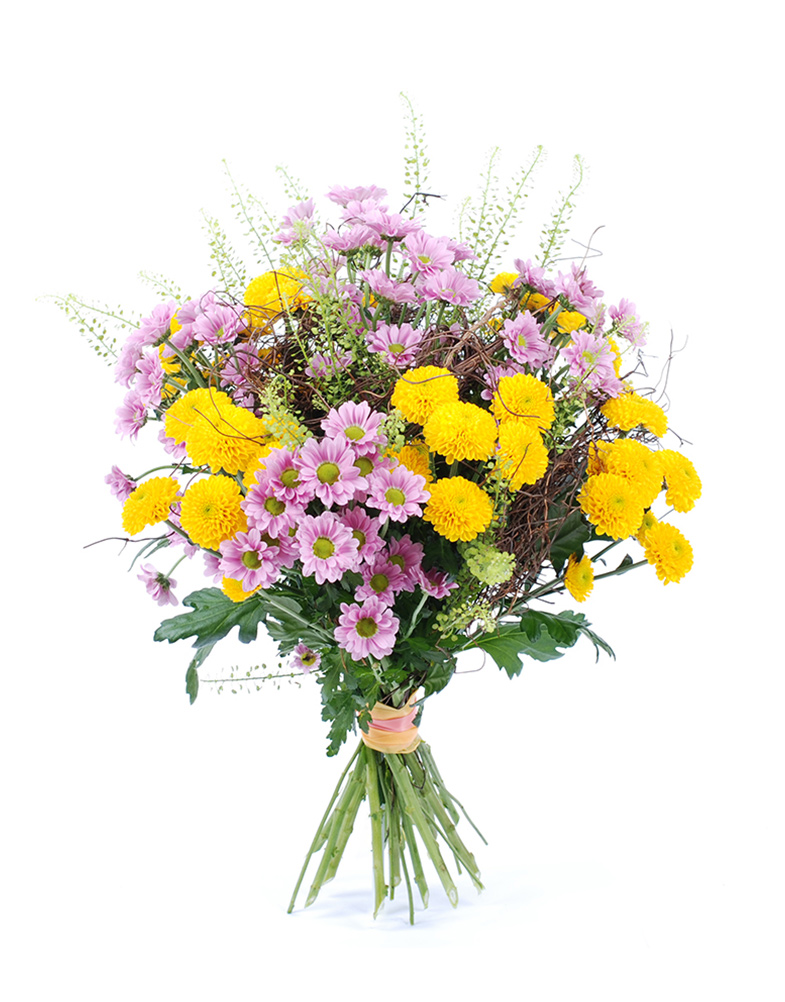 Mõnusa rõõmu ja sooja sära toob sinuni meie lillekimp „Hilda”, kus kollased ja roosad santini krüsanteemid kohtuvad harmoonias. See kimp on nagu päikesekiir ja armsa roosakas õhtu kokkukuuluvus — ideaalne valik, kui soovid edasi anda rõõmu, hellust või lihtsalt kaunist hetke.