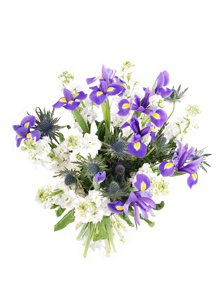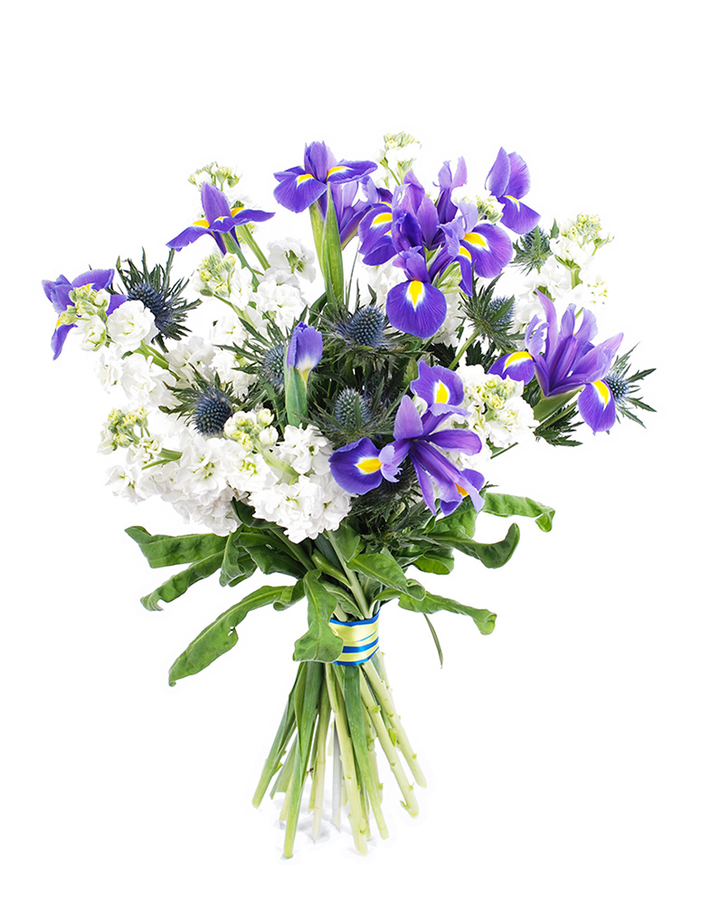 Lillekimp sini-valgetest lilledest. Kimbus on iiriseid, levkoisid ja ogaputke.