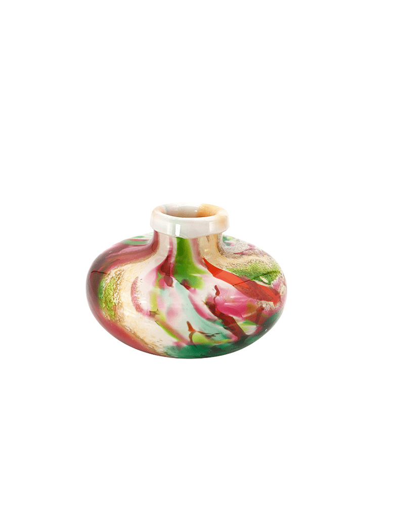 Värvilisest klaasist käsitsi puhutud väike madal klaasvaas.